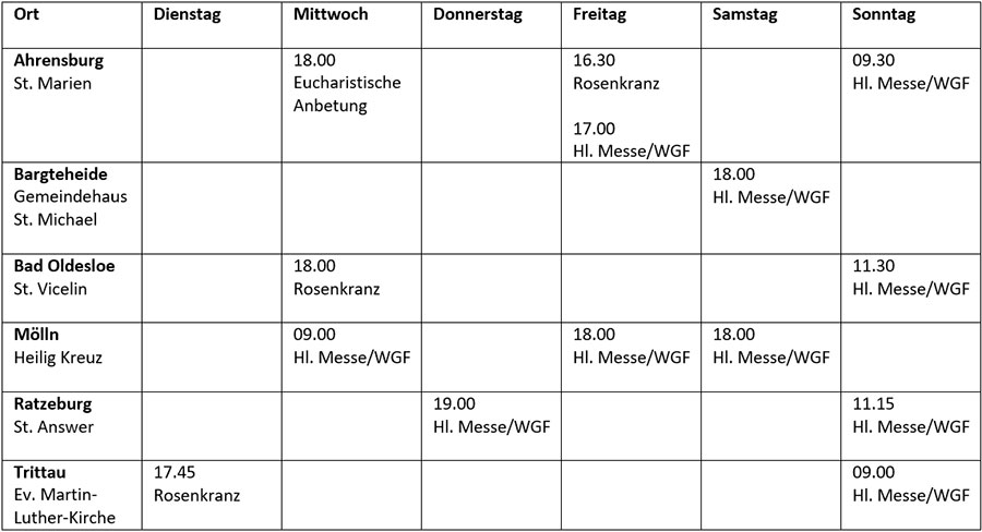 finden Sie in den Wochenblättern unserer sechs Gemeinden. Für (Hoch-) Feste werden besondere Gottesdienstzeiten festgelegt und jeweils rechtzeitig veröffentlicht. Außerdem finden täglich Gottesdienste im Kloster Nütschau statt – weitere Informationen finden Sie hier.