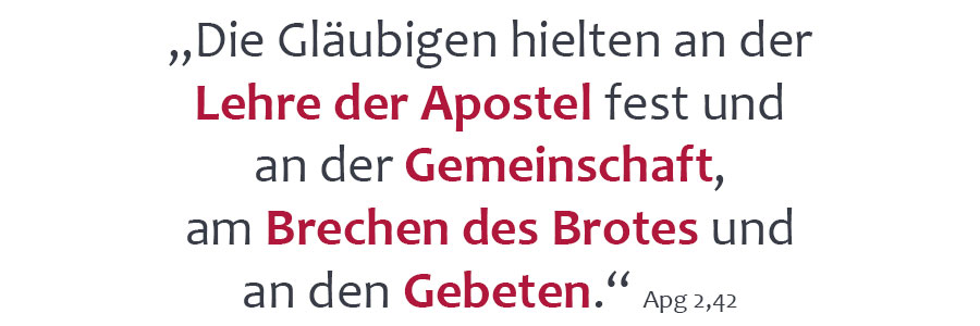 42 Die Gläubigen hielten an der Lehre der Apostel fest und an der Gemeinschaft, am Brechen des Brotes und an den Gebeten. 43 Alle wurden von Furcht ergriffen; und durch die Apostel geschahen viele Wunder und Zeichen. 44 Und alle, die glaubten, waren an demselben Ort und hatten alles gemeinsam. 45 Sie verkauften Hab und Gut und teilten davon allen zu, jedem so viel, wie er nötig hatte. 46 Tag für Tag verharrten sie einmütig im Tempel, brachen in ihren Häusern das Brot und hielten miteinander Mahl in Freude und Lauterkeit des Herzens. 47 Sie lobten Gott und fanden Gunst beim ganzen Volk. Und der Herr fügte täglich ihrer Gemeinschaft die hinzu, die gerettet werden sollten.